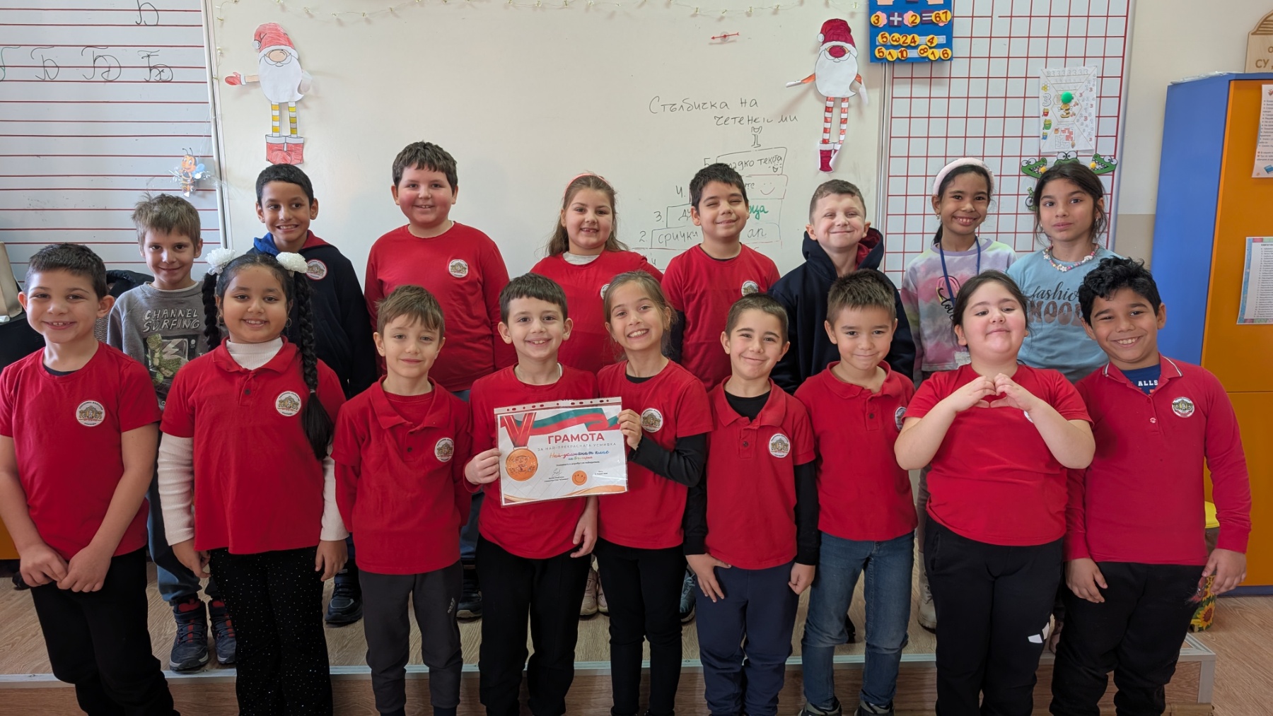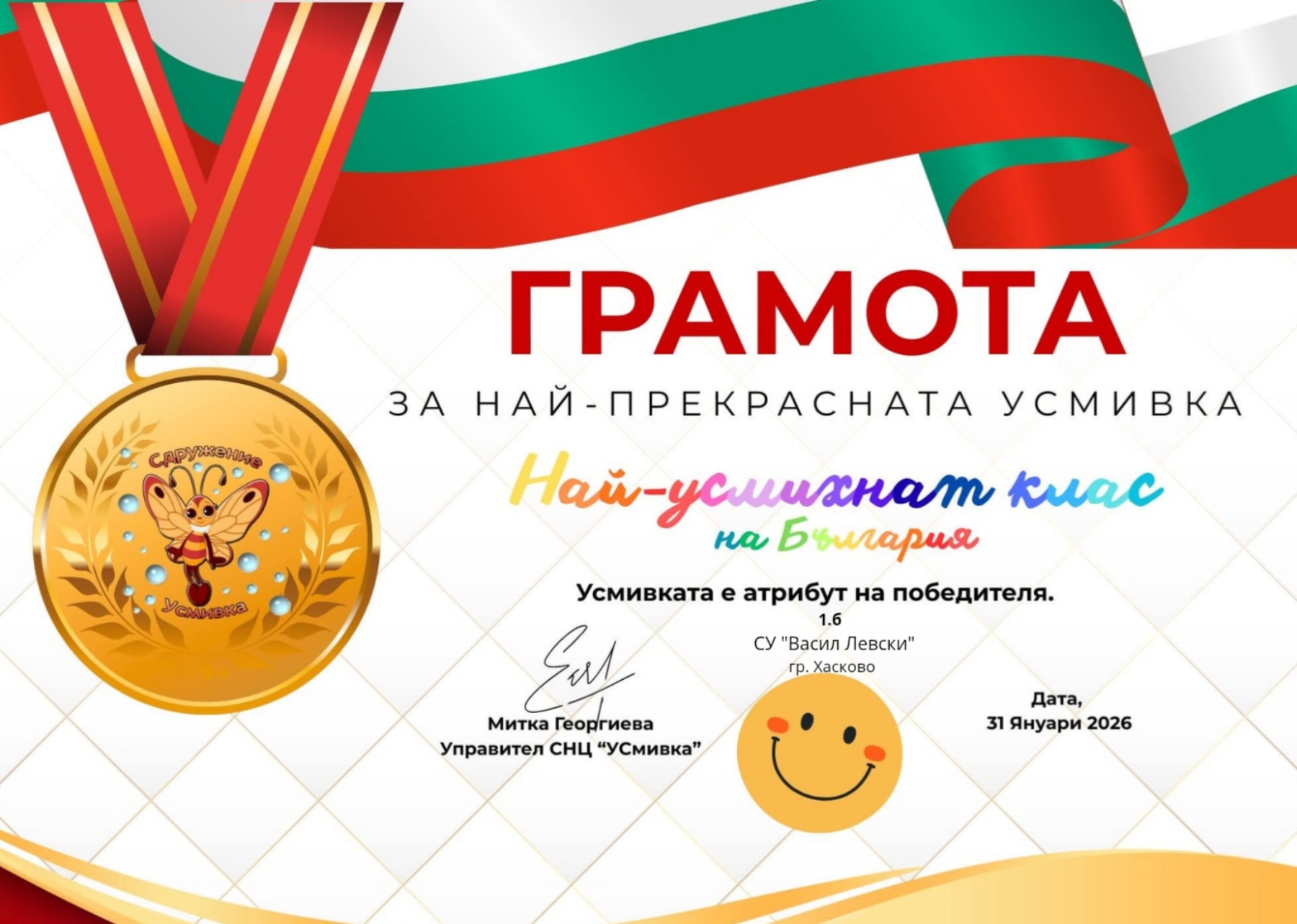 С много радост споделяме, че учениците от 1. „б“ клас бяха отличени с грамота „Най-усмихнат клас на България“. Това признание е отражение на искрените детски усмивки, топлата атмосфера и сплотеността, които децата създават още от първите си дни в училище.