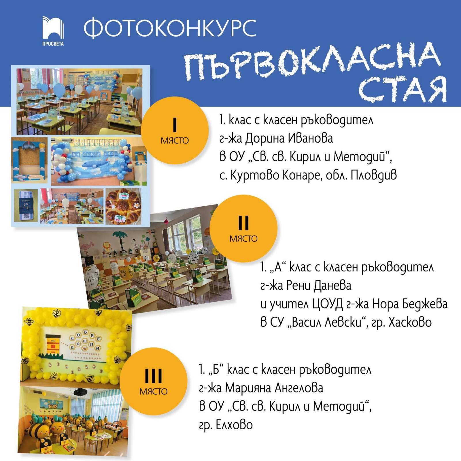 На 15 септември, заедно с празничното откриване на новата учебна година, ние, учителите на 1.А и 1.Б клас при СУ „Васил Левски“ – гр. Хасково, се включихме във фотоконкурса „ПЪРВОКЛАСНА СТАЯ“, организиран от издателство „ПРОСВЕТА“. В инициативата се включиха и десетки учители от цяла България, които представиха своите уютни и вдъхновяващи класни стаи.