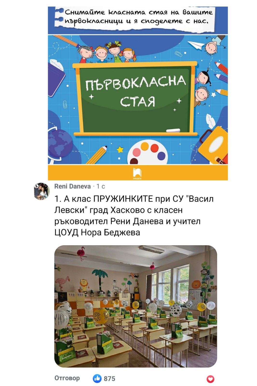 На 15 септември, заедно с празничното откриване на новата учебна година, ние, учителите на 1.А и 1.Б клас при СУ „Васил Левски“ – гр. Хасково, се включихме във фотоконкурса „ПЪРВОКЛАСНА СТАЯ“, организиран от издателство „ПРОСВЕТА“. В инициативата се включиха и десетки учители от цяла България, които представиха своите уютни и вдъхновяващи класни стаи.