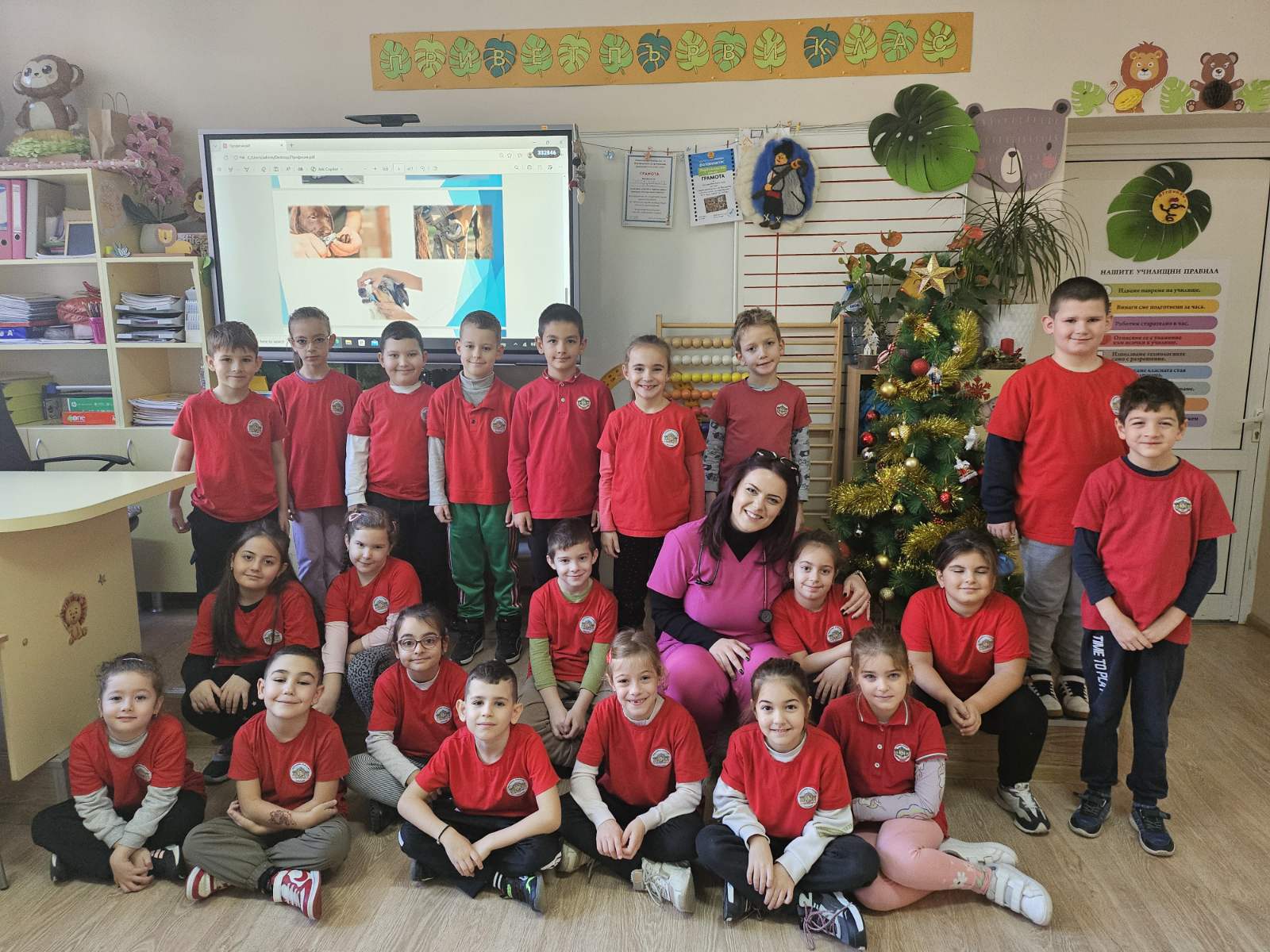 На 12 декември учениците от 1. А клас имаха вълнуваща среща с д-р Александра Стефанова – практикуващ ветеринарен лекар и част от ветеринарномедицинската колегия и екипа на ветеринарна клиника Diamond. Поводът беше предстоящият професионален празник на ветеринарните лекари – 14 декември. Ден, посветен на хората, които се грижат за здравето и щастието на животните.